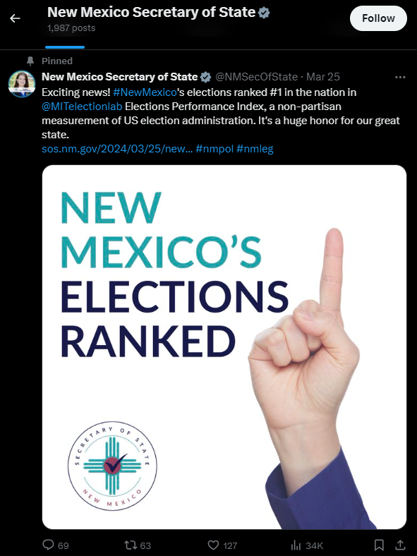 Rumor vs. Reality vs. Math ErrorsEverybody makes mistakes, but the audit report remains online without acknowledgement of the anomaly.The federal and state governments have a process for promoting the accuracy of elections through "rumor vs. reality" web pages on government web sites, such as https://www.sos.nm.gov/voting-and-elections/voter-information-portal-nmvote-org/rumor-vs-reality/. Accurate elections are considered "reality" and challenges to accurate elections are "rumor." The MIT Election Lab rates New Mexico as having the #1 election process https://elections.mit.edu/#/data/map?view=state-profile&state=NM&year=2022. Per social media post below, New Mexico is very proud of the endorsement from MIT.